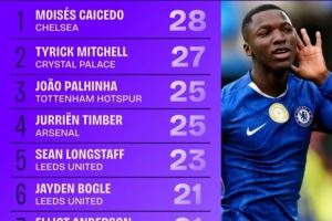 本赛季英超抢断榜前十:凯塞多28次第一,廷伯25次第四